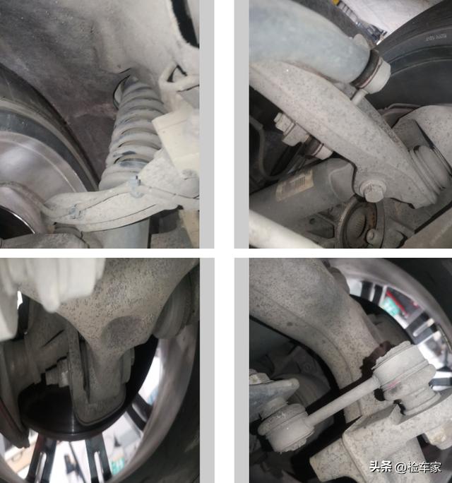 底盘部分首先检查了一下四个悬挂,可以看到没有渗漏,但左右前悬挂有拆装更换的现象,车主之前也解释过,前面碰撞后一道就换了新的。半轴内防尘套倒是也不存在渗油,而且后悬挂都还是原厂状态,符合整体的公里数情况,由此也可以了解到,车主的理念就五个字:不高兴就换。